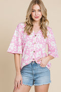 BOMBOM Floral Decorative Button V-Neck Top