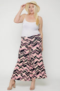 Experience the perfect blend of comfort and bold style that sets these pants apart. The Chevron print, coupled with a banded waist and wide legs, adds a dynamic and fashionable touch to your wardrobe.