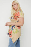 Experience the perfect blend of comfort and artistic flair that sets this tunic apart. The watercolor flower print, combined with short sleeves, a round neck, and an asymmetric hem, adds a vibrant and fashionable touch to your wardrobe.