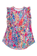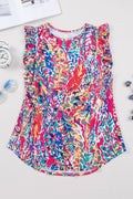 This is a gorgeous tank top featuring a blooming floral print and flattering ruffle sleeves. It has a loose fit for a relaxing wear and pairs well with jeans.